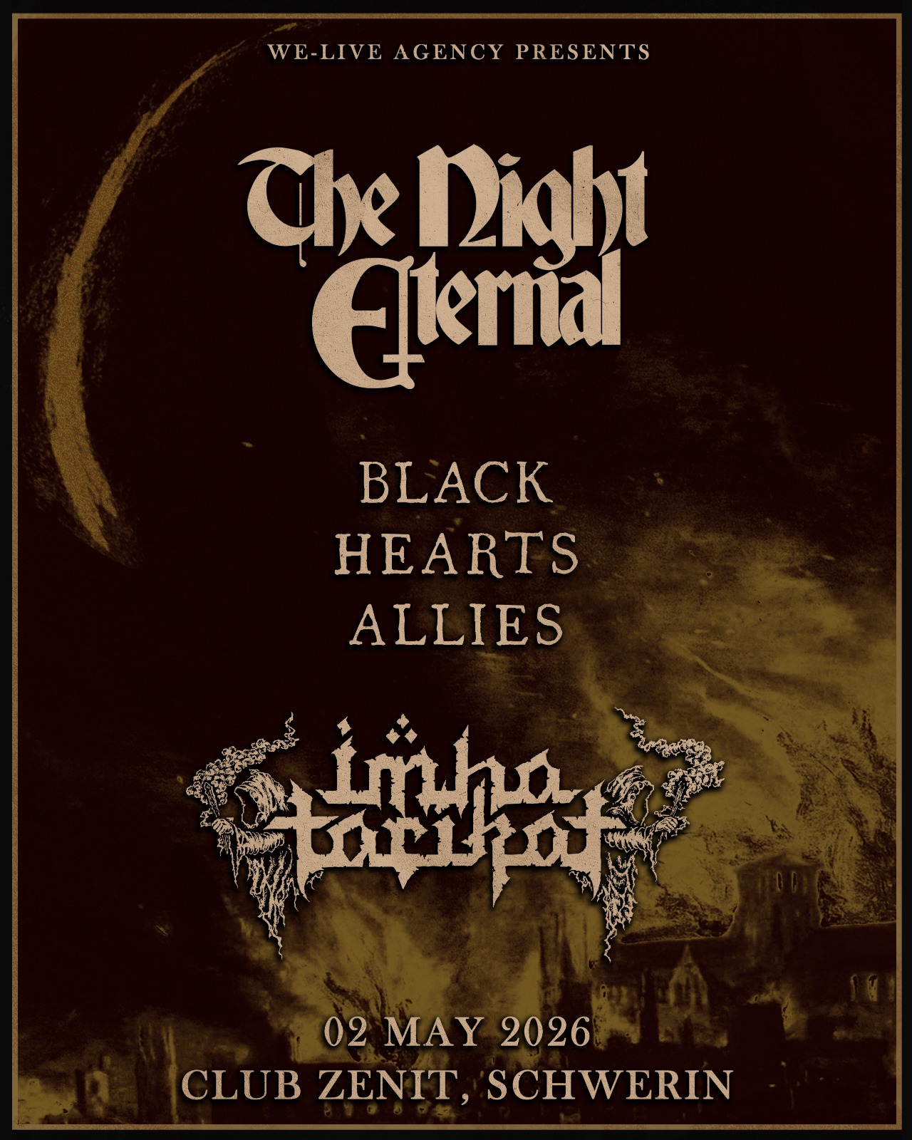 Die zwei jungen Bands haben sich im Metal-Underground bereits mit ihrer Bühnenpräsenz und Top-Platzierungen ihrer Alben einen Namen in ihren Genres gemacht. THE NIGHT ETERNAL vermischen klassischen Heavy Metal mit düsterer Atmosphäre und dunklen Melodien. IMHA TARIKAT stehen für kompromisslosen Black Metal mit intensiver Energie: treibend, aggressiv und dennoch voller Tiefe.